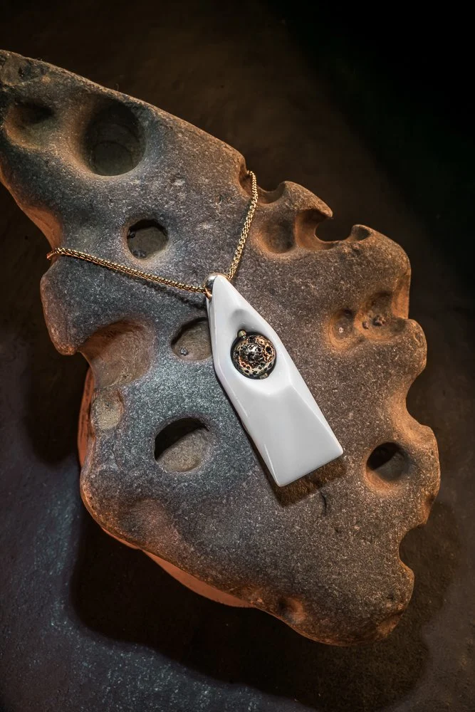 My unique geometric forms draw inspiration in part from contemporary design, Japanese architecture and Chess pieces. I utilize many custom miniature tools to shape the precise decorative elements